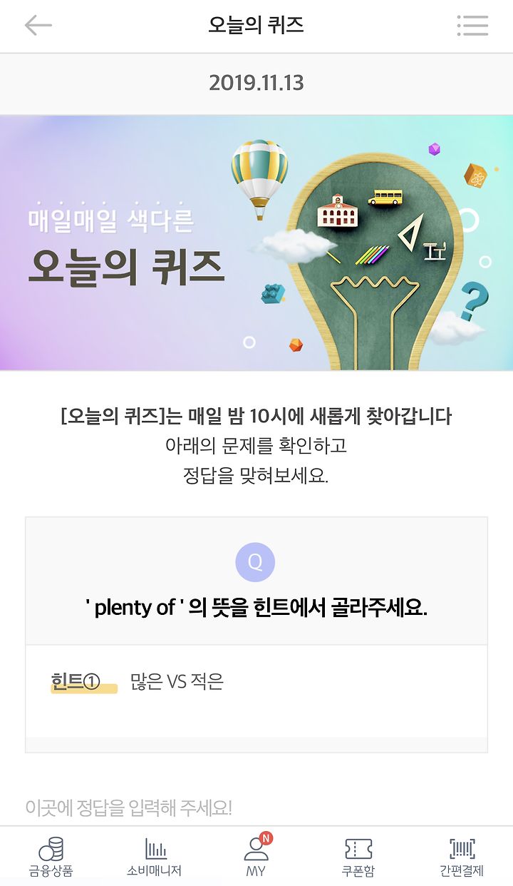 오늘의 퀴즈는 'plenty of'의 뜻을 고르는 문제였어요.