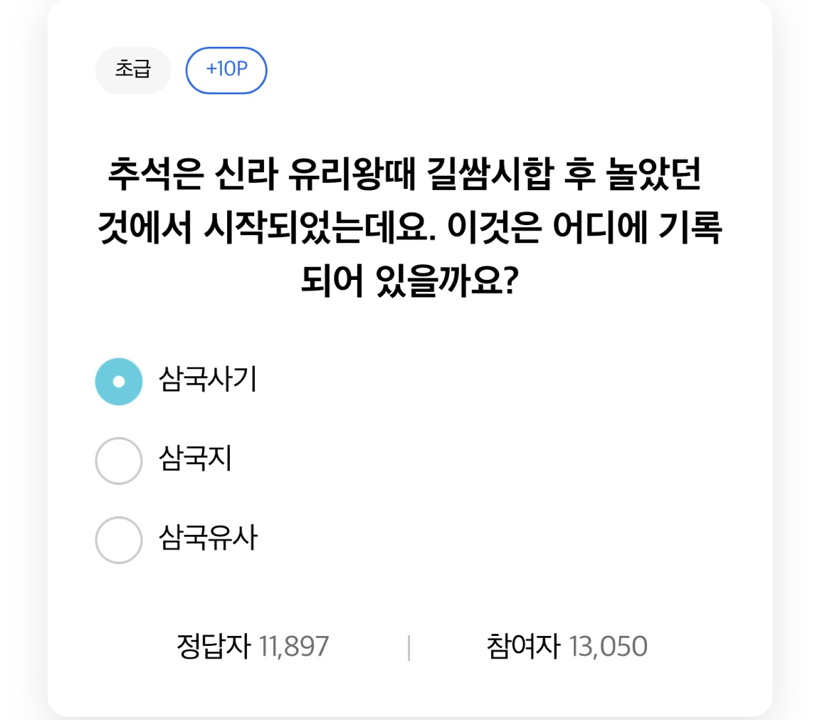 Q2) 추석은 신라 유리왕때 길쌈시합 후 놀았던 것에서 시작되었습니다. 이것은 어디에 기록되어 있을까라는 문제입니다.