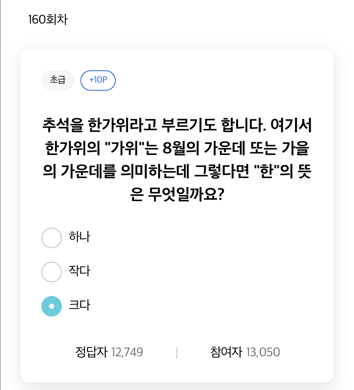 160회차 일반상식 문제는 곧 다가올 최대의 명절 추석에 관한 퀴즈였습니다.