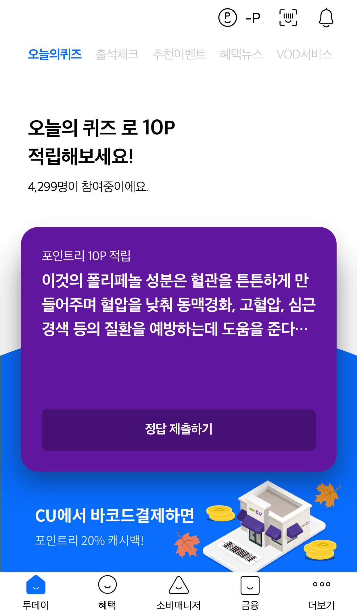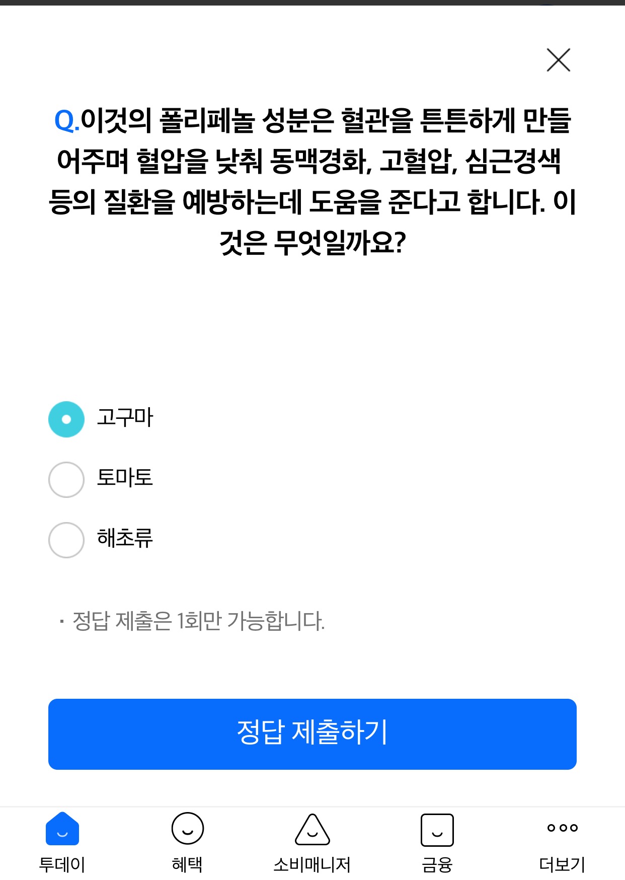 오늘의 퀴즈는 이것의 폴리페놀 성분은 혈관을 튼튼하게 만들어주며 혈압을 낮춰 동맥경화, 고혈압, 심근경색 등의 질환을 예방하는데 도움을 준다고 합니다. 이것은 무엇일까요?