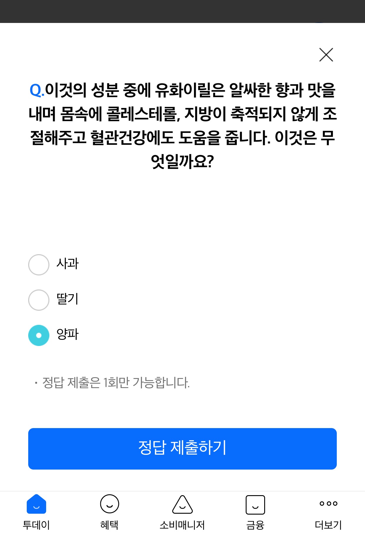 오늘의 퀴즈는 이것의 성분 중에 유화이릴은 알싸한 향과 맛을 내며 몸속에 콜레스테롤, 지방이 축적되지않게 조절해주고 혈관건강에도 도움을 줍니다. 이것은 무엇일까요?