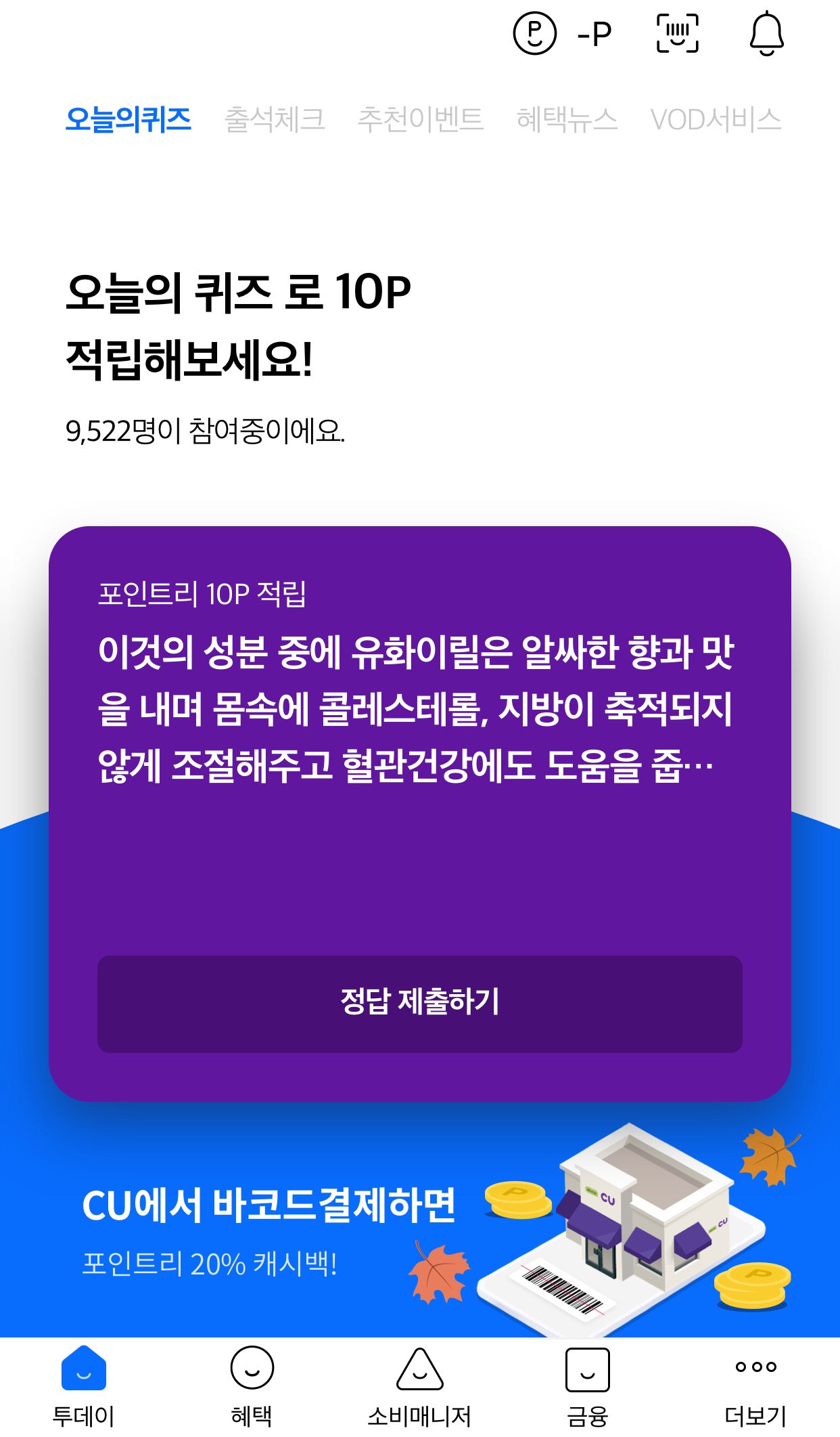 오늘의퀴즈 정답 맞추고 10p받으세요.