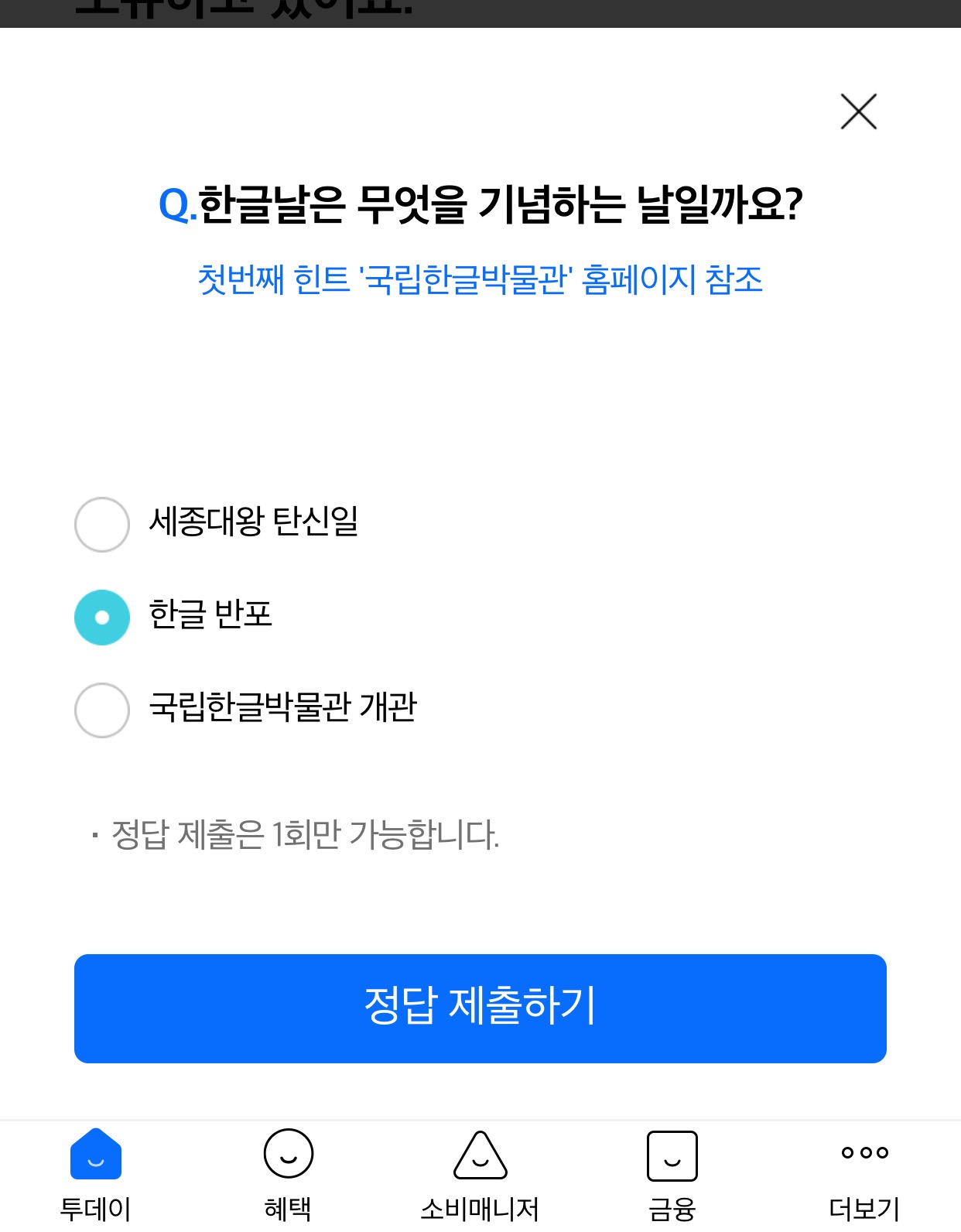 정답은 한글 반포 입니다.