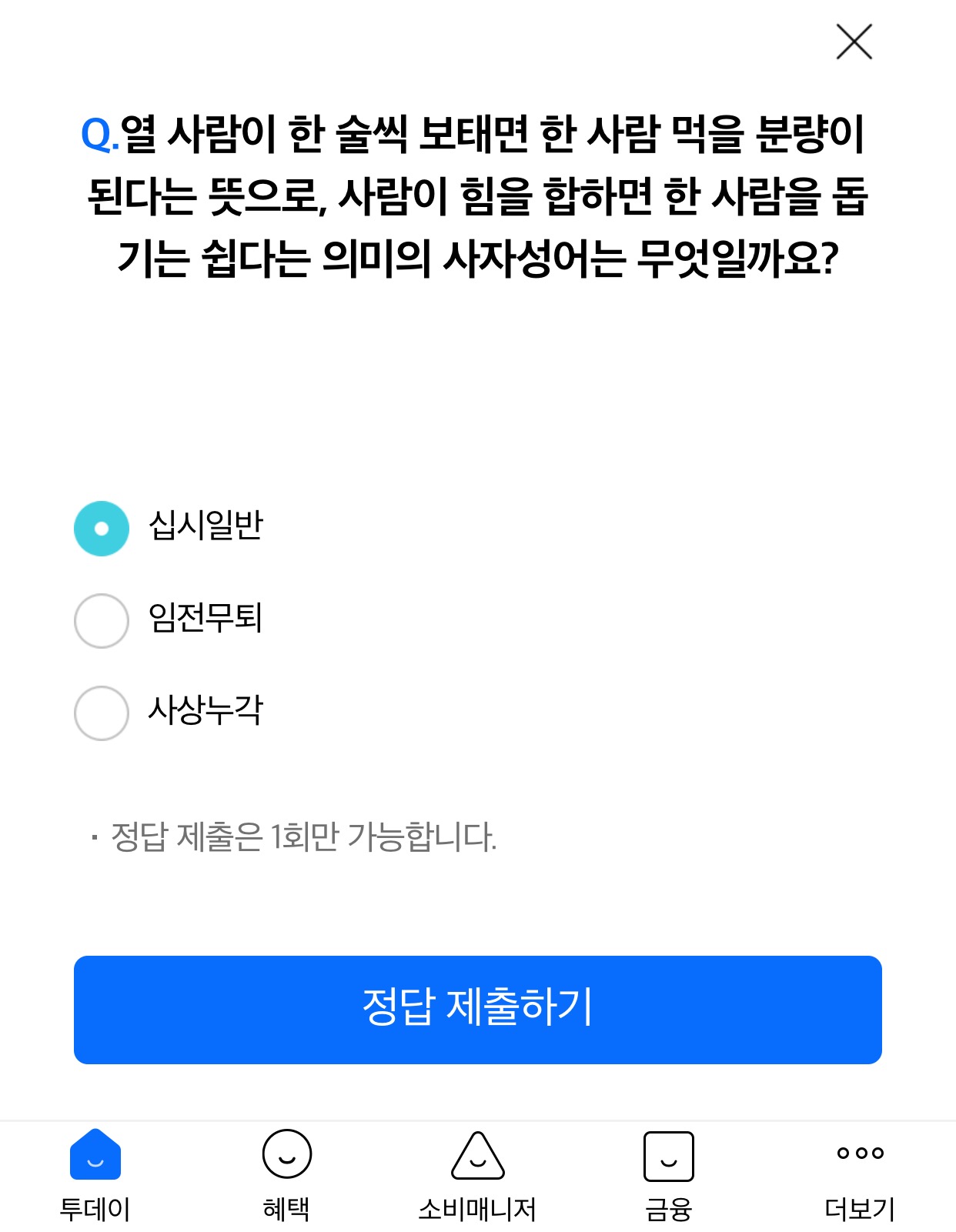 열 사람이 한 술씩 보태면 한 사람 먹을 분량이 된다는 뜻으로, 사람이 힘을 합하면 한 사람을 돕기는 쉽다는 의미의 사자성어는 무엇일까요?