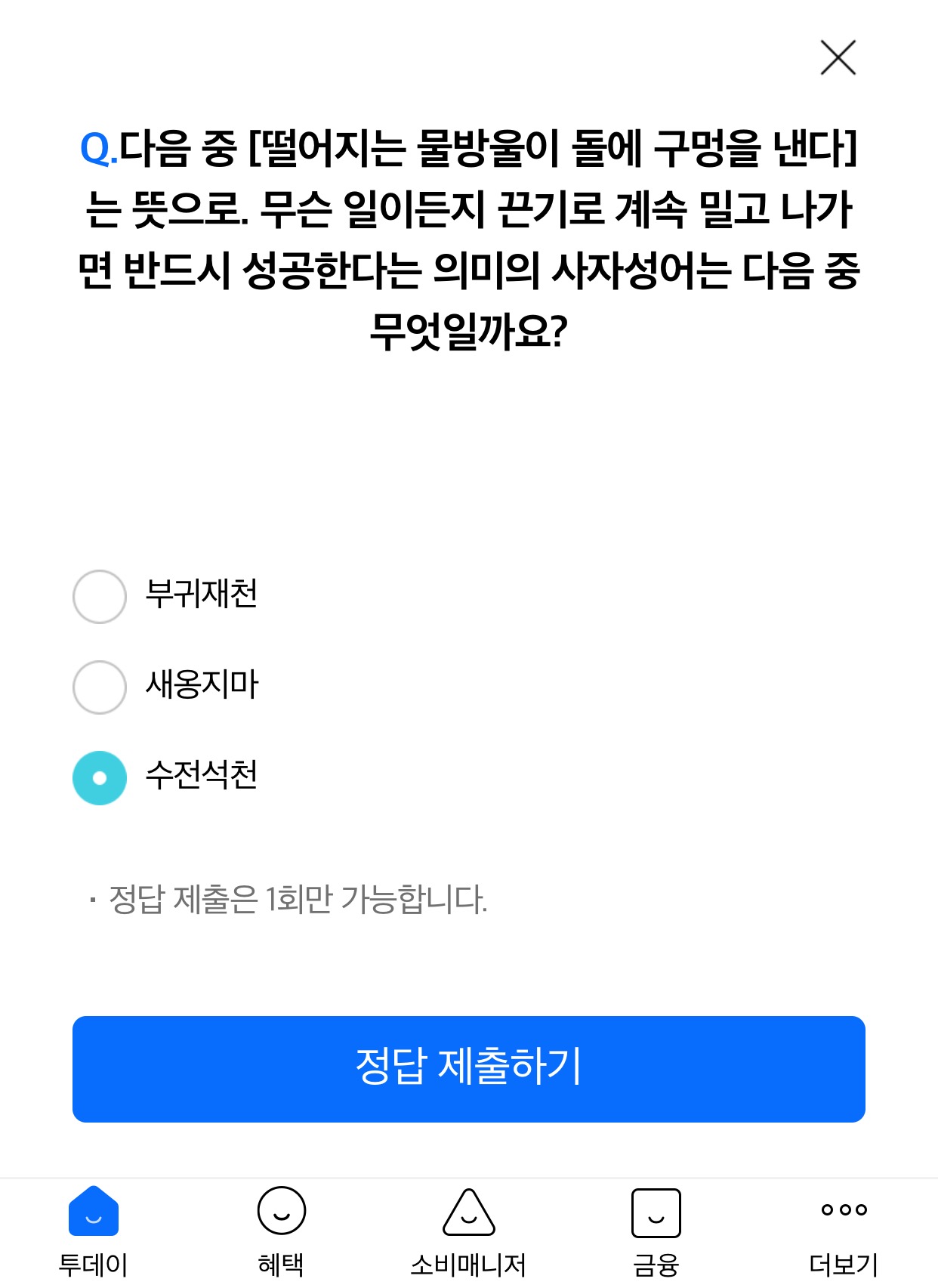 다음중 떨어지는 물방울이 돌에 구멍을낸다는 뜻으로, 무슨 일이든지 끈기로 계속 밀고 나가면 반드시 성공한다는 의미의 사자성어는?